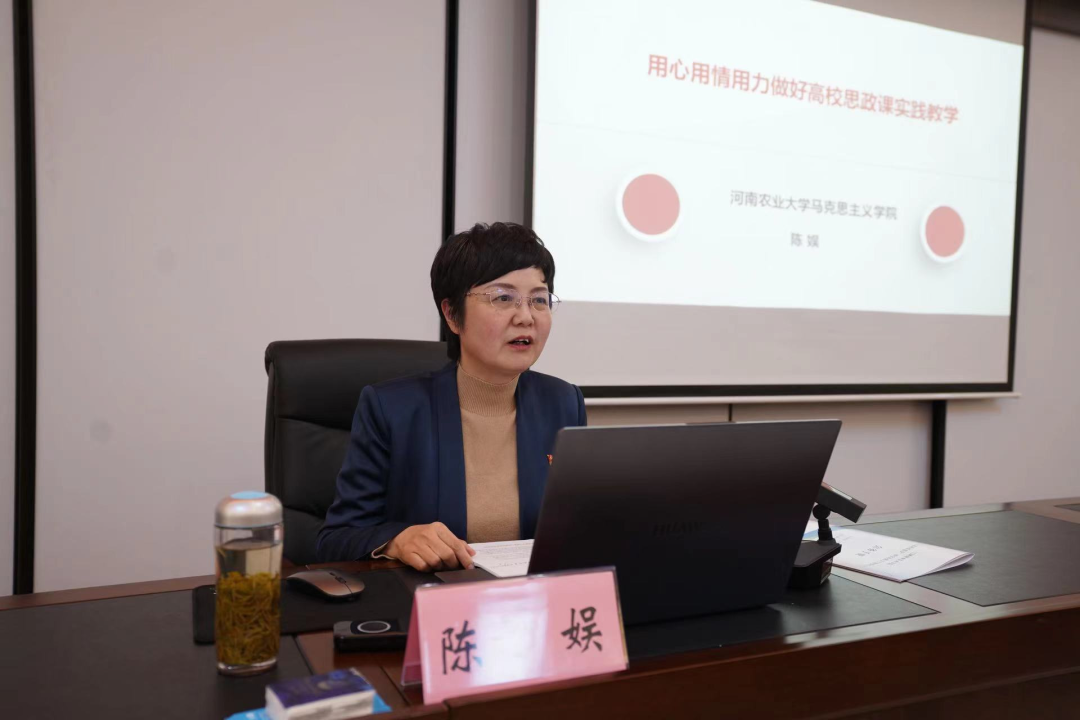 全国高校思政课名师工作室(河南农业大学)负责人陈娱教授以《用心用情用力做好高校思政课实践教学》为题,介绍了高校思政课实践教学的缘起,阐释了高校思政课实践教学的内涵与价值,结合长期教学经验深入分析了高校思政课实践教学的现实与困惑,分享了基于课程性质、行业特点、地方资源、馆课结合的高校思政课实践教学模式。在遵循全员参与、过程可控、教师主导、员工主体、形式多样、综合考评的基本原则基础上,就如何打造思政课实践教学品牌提出了形成统一行动、凝聚广泛共识,建立健全实践教学品牌化的保障体系,建立完善的实践教学品牌化考评体系,通过创新形式进一步拓展实践教学品牌化内容,继续扩大覆盖课程和受众员工五方面的对策,并对公司各门思政课初步形成的实践教学模式和成果进行了诊断和点评,提出了建设性建议。报告内容全面详实,思想深刻且引人入胜,是一场有滋有味有灵魂的思政“金课”。
