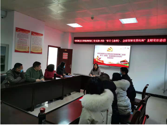 为进一步发扬党内民主、加强党员队伍建设,保障党员履行义务、行使权利。1月18日下午,yl7703永利教师第二党支部组织全体党员在10105会议室开展2021年1月份主题党日活动,主题为:“学习《条例》、全面保障党员权利”,会议由支部书记朱丹果主持。